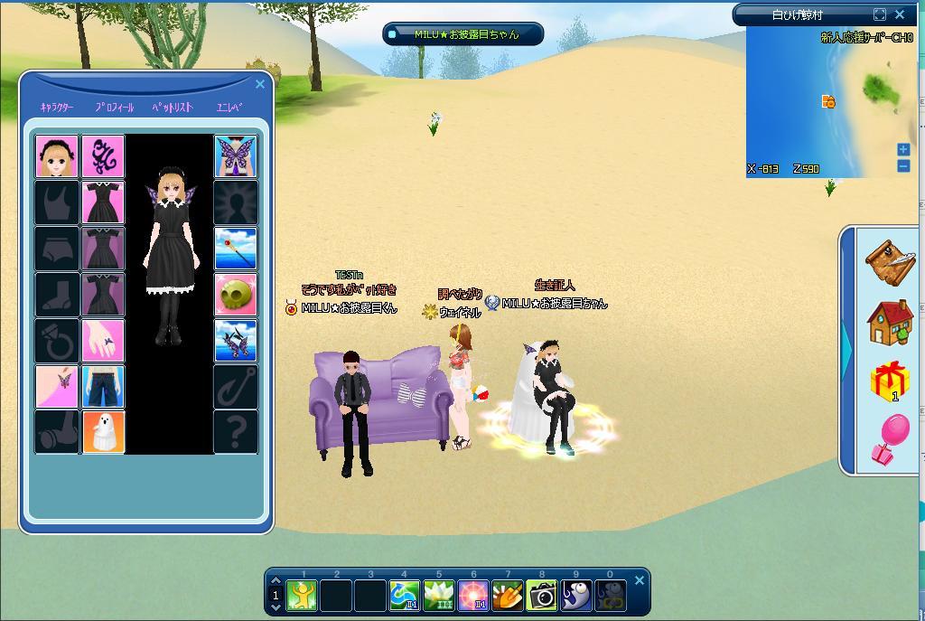 パープルリボンソファは2人座りができます。イベ服にバラフライのアイテムなどがいいですね。