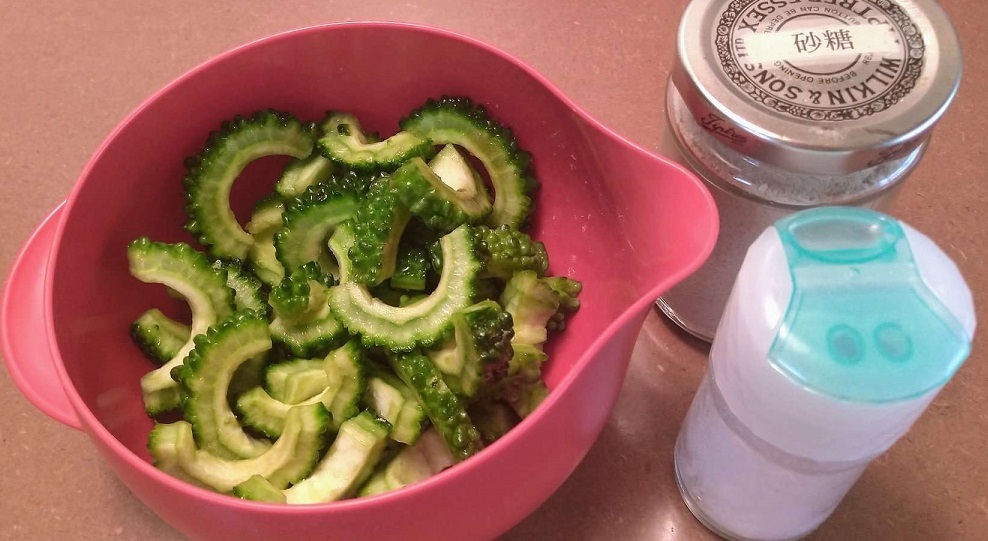 ゴーヤの苦みが苦手な方(ビビちゃん)は、砂糖と塩少々で揉んでみてください。
