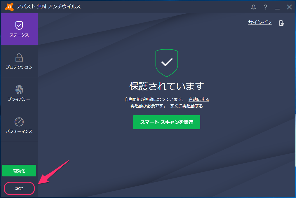 (1) アバストのコントロールパネルを開いて、「設定」をクリックする。