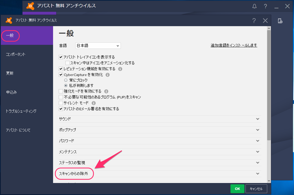 (2)「一般」メニューの「スキャンからの除外」をクリックする。