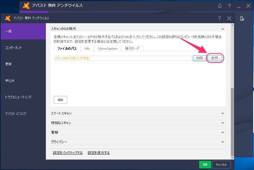(3)「スキャンからの除外」の項目内の「参照」ボタンをクリックする。