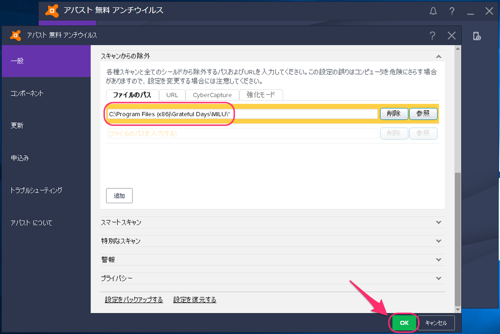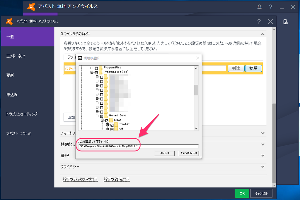 セキュリティソフト内で『MILU』の「検出除外設定