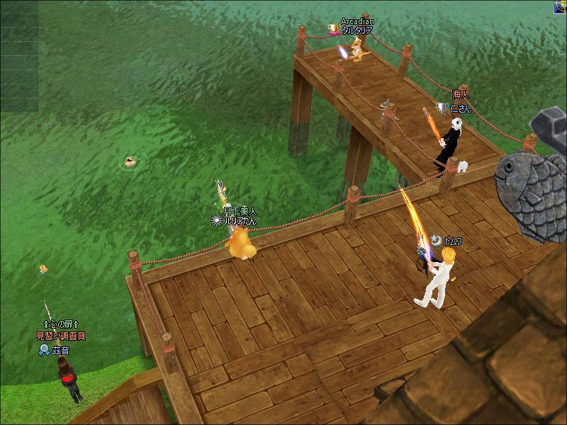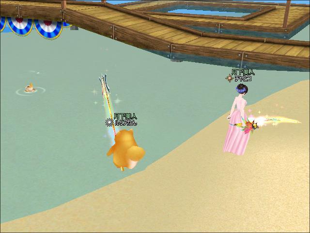 お昼過ぎ、1鯖生け簀付近で、ギルマスのチャピコさんと釣りをしたわ。