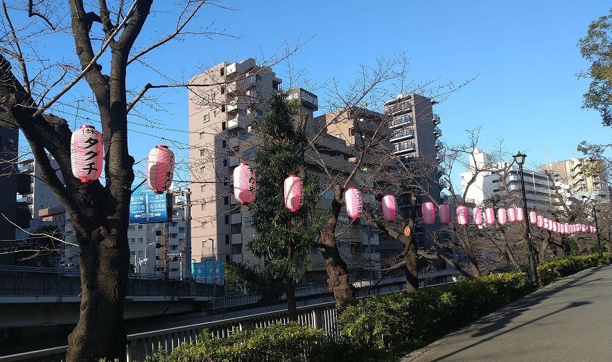 江戸川公園エリア側は 恒例の桜まつり提灯が吊られて準備万端