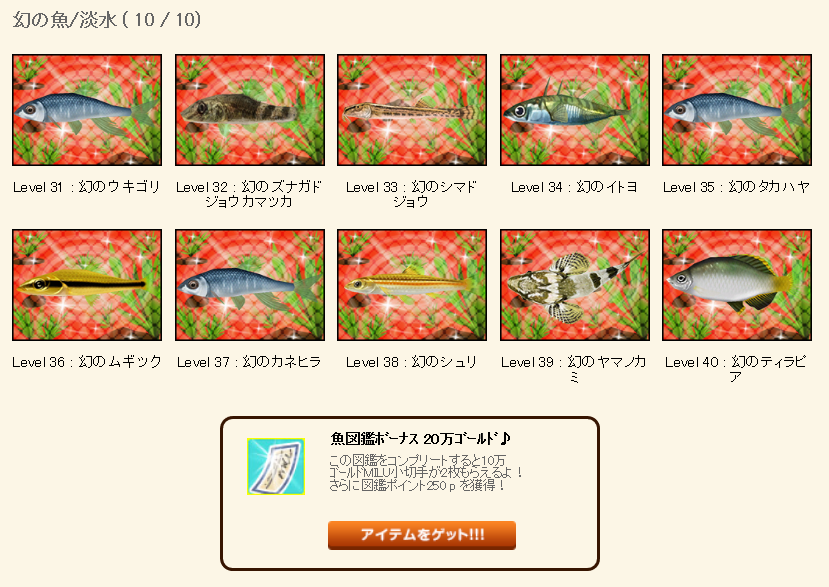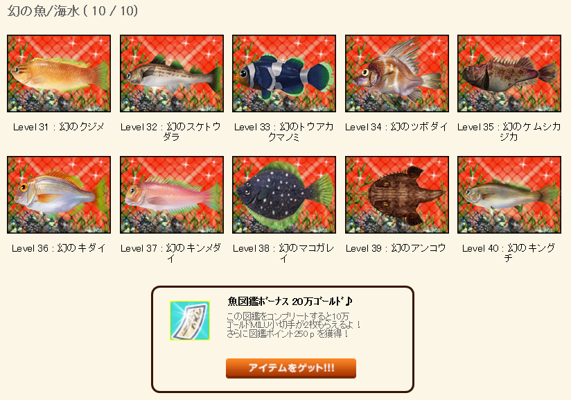 またまたお魚図鑑完成おめでとうございます。:.゚ヽ(´∀`。)ノ゚.:。 ゜ |