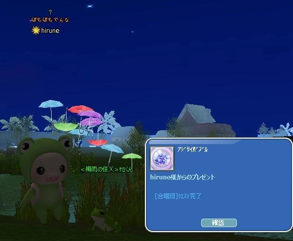 梅雨時期はジメジメして好きじゃない! カタツムリやカエルを可愛いと思ったことはない!w ま・・MILUの梅雨イベ色々は可愛いと思います☆ 案内板のクエ残して、イベクエ完了 カエルさん見つけた♪ ケロくんに報告よち☆ いっせんまんのおすそ分けが♪ ちゅぴちゃん+(人・∀・*)+。アリガト♪ 緑文字(b`・Д・)bおめで㌧♪ 父ちゃんからシルコジさんきゅ❤アズさんから~ 緑本の中身が埋まってきたでござる!+(人・∀・*)+。アリガト♪ 時限クエが始まったので、 イベ釣り三昧するざんす(・ε・)ノ おっー!