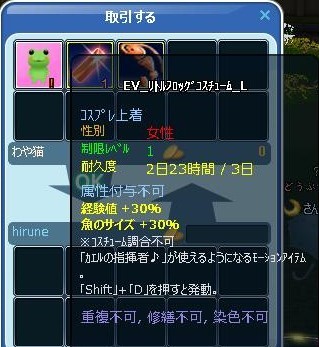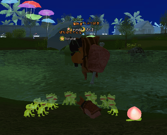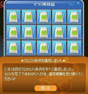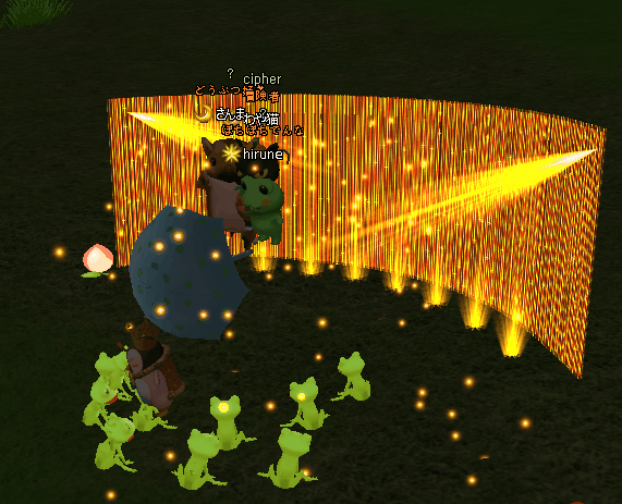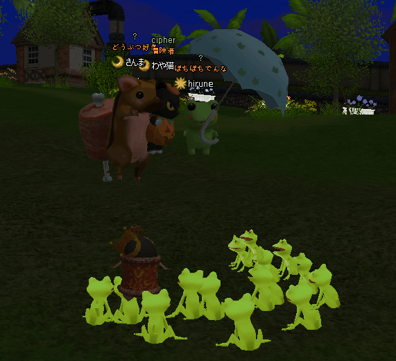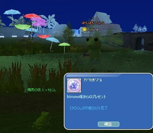 痛がってる人に・・・ 「痛いの痛いの飛んでいけ~」というのは言いますw 少しでも痛みが和らいだらいいな~な気持ちを込めて☆ でもさ、おまじないっていうのは・・ よくないことに遭わないように唱えるような…気もする☆ チーム対抗戦が終わってから、梅雨イベ2週目の掘りイベ開始 父ちゃんからカエル貰った♪ +(人・∀・*)+。アリガト~ケロケロ♪ 30掘って~ 箱の出よし☆ いつものように、20箱開け☆コレブ2種でた~ヾ(〃^∇^)ノわぁい♪ クエ完☆ そして、ケロくんに報告よち☆ 頂いた飴を配って~カエルさん大合唱♪ 角度を変えて~ケロケロ♪ 豪華なステージまで出来てたwww ご協力感謝❤