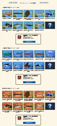 魚図鑑は「レア特殊魚」2匹を除き、魚レベル119まで穴埋めは終わっています。