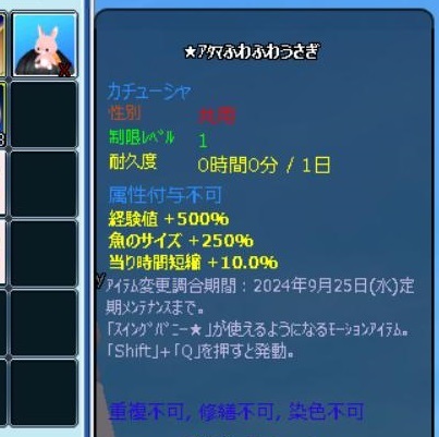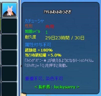 か、可愛いっ 頭にちょこんと乗ってる~ 見た目も可愛いし、属性もいいっ (修繕費が鬼のようなんだろうけど) しばらくは乗っけておくかな^^ ちなみに、白うさぎちゃんはポシェットです