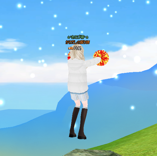 雪だー!うれしさで浮いてる!今日の日替わりポンポンは赤黄!