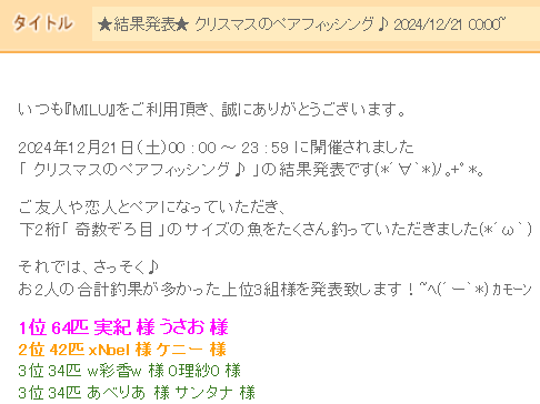 クリスマスのペア釣りイベントがあったのですが、