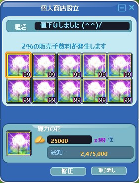 スキルブック調合キャンが来たので、これは!と思い魔花を1個4万Gに設定・・・