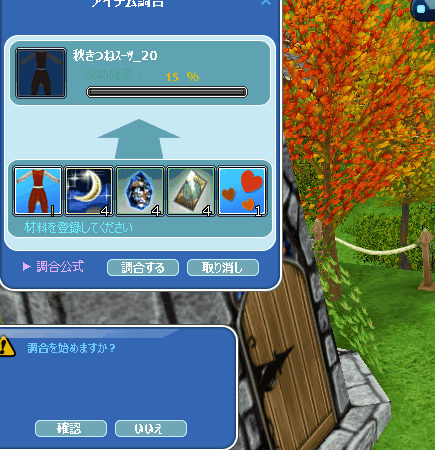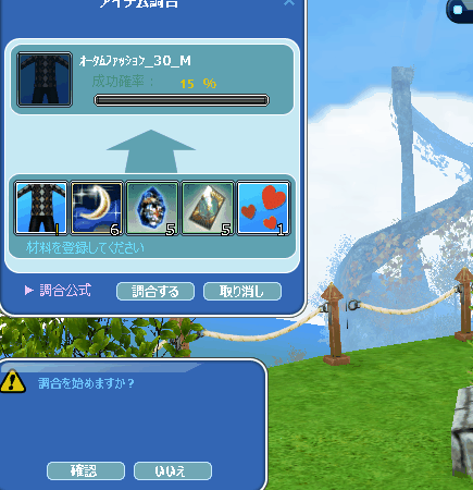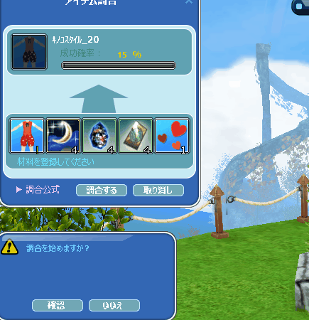 メンテ時間短かったけど掘りイベあってよかったです~。ホリホリしてたら3種類の服出がたので、そんなに欲しくはなかったけどシャシャで調合してみました。そしたらなんと3着とも1発成功w。こんなことは初めてです。シャシャさんの機嫌相当良かったみたいですw
