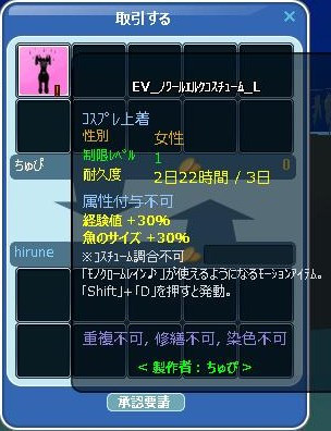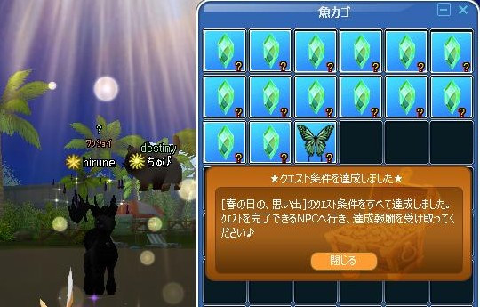 お出掛けしたので、ちょいと遅めのゲームイン ノワールエルフのEVコスを頂きました!゚+(人・∀・*)+。アリガト♪ 昔のペットと同じコス☆ 付いてたエモの、モノクロームレイン♪ ちゅぴちゃんのコスは、修繕可なのよヽ(*´∀`)ノオメデト─ッ♪ ぽっちゃりシャムコスも修繕可☆凄い! チッチャイから悩む~~仰られて直ぐに緑文字だったので… 『ぉお!』だったw (σ´・ω・)ネェネェ~遊ぼう♪ 寝た!!!!( ´゚ω゚`):;*.':;ブッ 45匹目に、蝶々キタ━━━━━(゚ ∀゚ )━━━━━!!!!! クエ完(`・ω・´)ゞ 報告は、浜のメリーゴーランドのビアンカ(・`ω・)ゞデシッ!!
