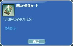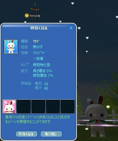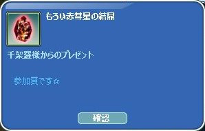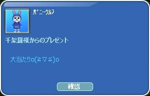 お題日記皆勤賞ラッキーチャンス賞☆ 接続不具合補償 千架羅さん日記抽選会で、ハズレた人に参加賞も!ありがと❤ そして・・なんと!!! 大当たり☆ヾ(〃^∇^)ノわぁい♪ 大当たりセットまで゚+(人・∀・*)+。アリガト♪ 昨年当たったウサギさんは、一匹狼な男の子を選びました♪ ウサギなのにオオカミって面白いでしょ?(´∀`*)ウフフ ウルフなのにバニーなお子は、お肉の子にして… お肉が80レベ達成したら、お誕生祝いにする予定❤(*´σー`)エヘヘ 優しいちゅぴちゃんに、すっかり懐いちゃった旦那様なりww PT応援゚+(人・∀・*)+。アリガト♪ 2日にUPしたばかりなのに… もう経験値バーは60%まで到達した模様(・`ω・)ゞデシッ!! るりちゃ&ろっぷさん&たぼさん~ドーピングありがと❤ 育ち盛りな(*´ω`*)になってるお肉なの~~ 後で、切り分けるからねっ!(マテマテw このエモ面白い(*・ω・*)ノ『Йё』 時限クエは、3まで終わりそう・・4は無理だなw メンテ明けに(*´ω`)o【マタネ♪】o