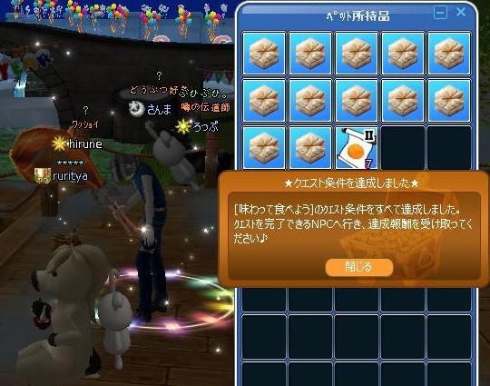 ピシュルから始まるイベクエ2週目☆ 次のモンテス横でユニコNPC居て、近くで好かった(*´ω`*) 掘り終わりの風景・・お腹満腹みたいだw 30掘り終わって、箱の出・・やや良し☆ ユニコに報告したら、次は20箱開け(`・ω・´)ゞ 青本1冊でた♪しかし・・緑本と中身は・・(´・ω・lll) いっぱい掘らないとダメらしい・・w クエ完 マジカル挑戦権とEVヅラが報酬だ☆ ユニコに報告よち(`・ω・´)ゞ ←こういうのw お肉はアゲアゲしかしてないので・・ 頑張って掘るYO!(・ε・)ノ おっー!!
