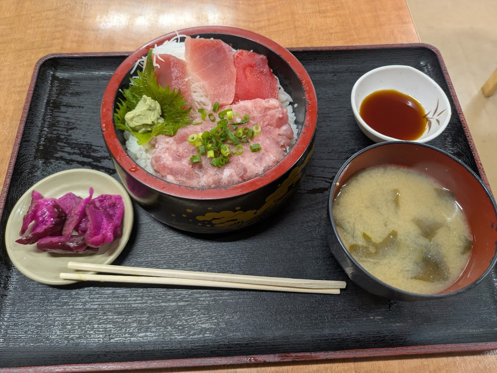 赤身が3切れ大根のつまがぎっしりと冷凍のネギトロ。ごはんは普通の白ご飯で温かく結構入っている。