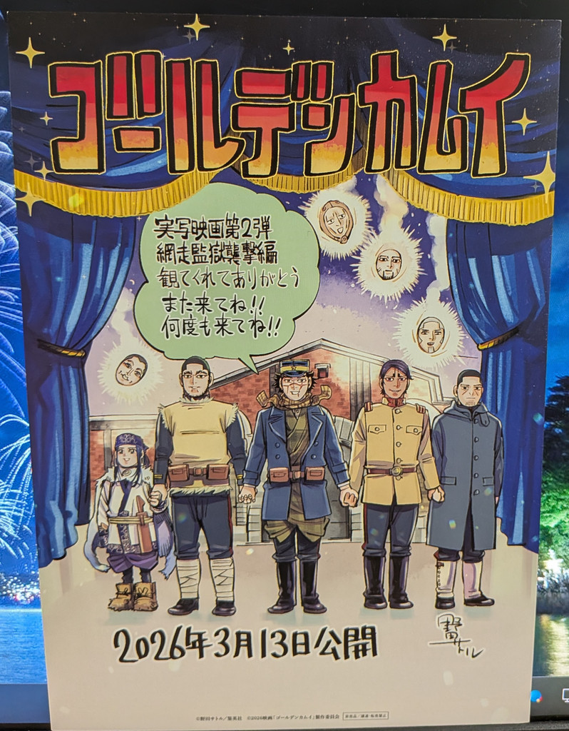 今日は、楽しみにしてた映画を観てきました♪ 暖かいお日和な我が地域でしたYO! 観てきた映画は・・ ゴールデンカムイ 網走監獄襲撃編 入場者プレゼント頂いた~ 裏側の絵かわいいw 厚手の紙で飾れそうな感じ☆ 映画は、前にも観てる続編なので~面白い! (*´pq`)クスクスッって笑える場面も多いので、好きです♪ お肉は日曜日に鑑賞済なので、語り合いたいと思います(*´ω`*) 詳しい感想は言わないように☆っと、口止めしてたのでww 時限クエ4終わったぁ~~ 緑本の中身は、 イヤリングをちゅぴちゃんに頂いて゚+(人・∀・*)+。アリガト♪ お肉の分だけで精一杯だったw 今夜、完成式します☆ 7のつく日は、さっき釣れた㋒∠( ̄∧ ̄) ビシッ 投稿します♪