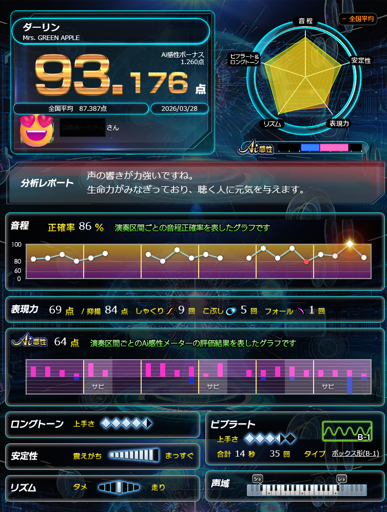 Mrs. GREEN APPLE の「ダーリン」で93点取れるようになりました!