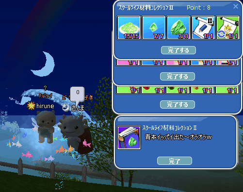 さて、明けて4月1日☆暖かいです~我が地域 室温20℃もあります! モコモコ靴下は脱げたけど… なんとなく膝掛け…でも、ちょっと暑いww さて、メンテ前の色々でも書きます㋒∠( ̄∧ ̄) ビシッ 残ってた課金餌で… ティーチャー釣れた!服着て泳いじゃ、溺れるっちゅーのw 輝くバブルに化けた☆ そして…呆け爺は… ハウスで愛でろって事かしら? 先生は、先生になったww 青春スクールイベ☆2週目☆のコレブは、3種3冊完成♪ セスナさん、家具2人分+(人・∀・*)+。アリガト♪ 調合一発☆(☝ ՞ਊ ՞)☝ウェーイ 二人掛けなので…カマーの脱力 ウリウリは、机の中に食べ物を見つけた模様ww ほんと食いしん坊なんだからぁあああああああああ! ドリンクとか、アレとかコレとかできなかったけど…ま、いいさw 今月も☆(*`・ω・´)ノヨロシクッ☆彡