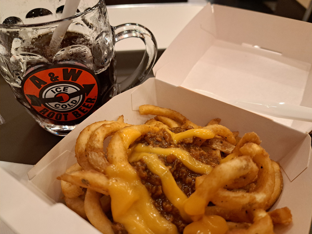 ↓はルートビアと、カロリー爆弾の「チリチーズカーリーフライ」(今日撮りました)