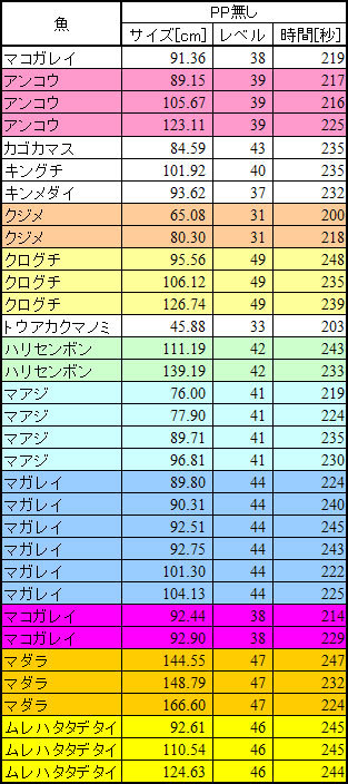 表を見る限り、魚の種類と魚のレベルを固定でのサイズと時間の相関はそう無い事が判明した。という事で、この調査を心置き無く終了したいと思う。