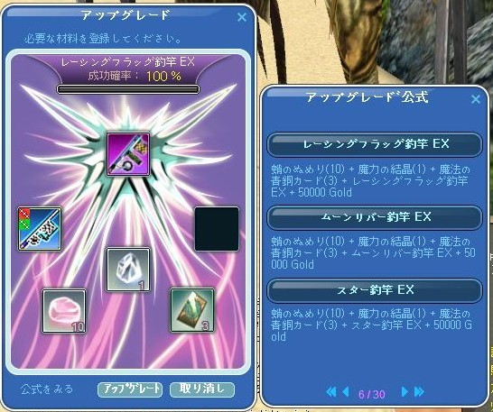 調合公式の1ページ目に出てくる「レーシングフラッグ釣竿」を押してもエラーで、しばらく悩みました。