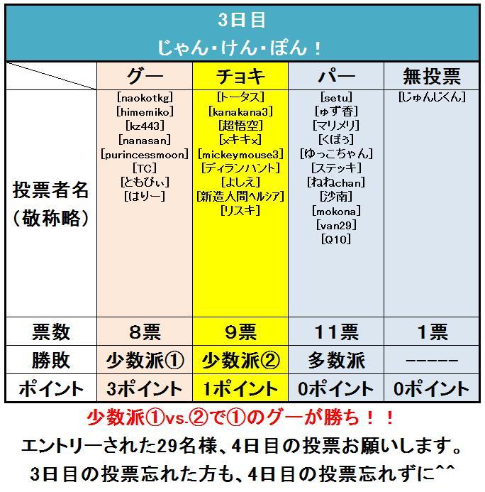 注意:2日目以降の投票は「ミラクルV」宛てにカードとメッセージでお願いします。