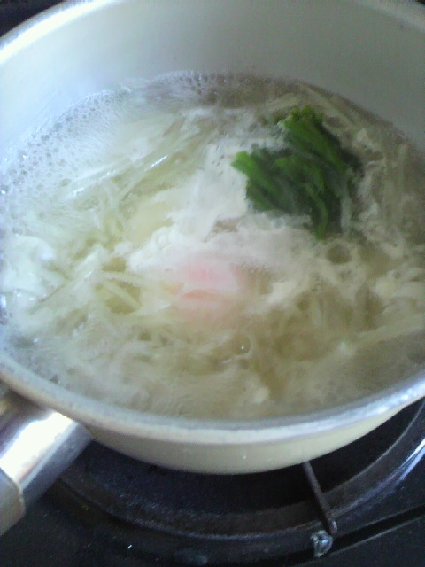 大根を千六本に切って・・水からゆで(レンジでチンすれば時短)、鶏がらスープの素小さじ2杯と冷凍してあったほうれん草1かたまり。