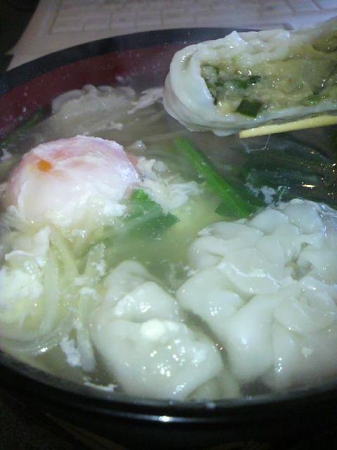 冷凍してあったにら饅頭を人数×2個入れて、卵を落とす。
