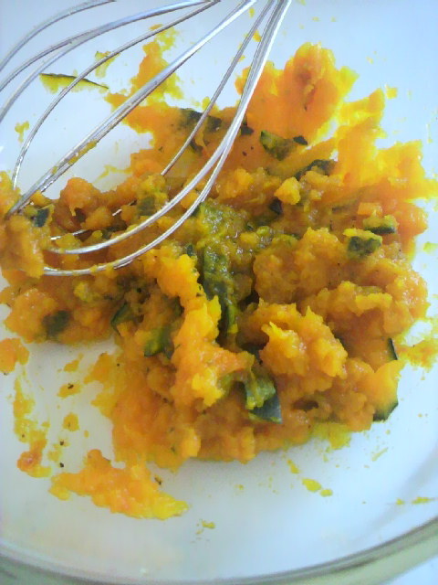 かぼちゃとひき肉を合わせて、マーガリンパン粉も少し混ぜ込み・・