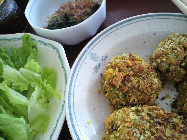 軽く成形して、表面にマーガリンパン粉をまぶしてオーブントースターで焦げ目をつけます。