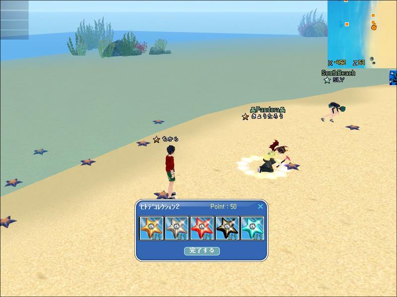 で、そばで掘っていたきょうたろうさんが、余ってるゴールドをシルバーに替えてくれ、SLYさんがレッドをくれたので…ヒトデ3も、エメラルドだけになりました。