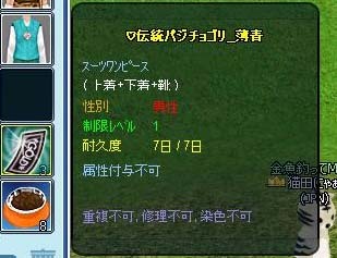 属性付与不可だし 修繕も不可なのでアレですが、着てみたい~ と言う人がいれば、タイガーフィッシュはKJで精密してみては如何でしょうか?ちなみに私は _D餌で釣ってましただけど、このLVのアイテムなので餌不問で出てくると思います (たぶん)
