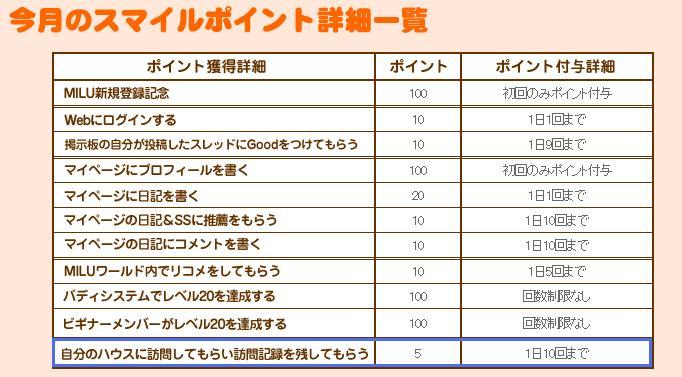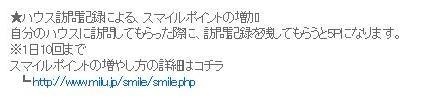ミルトモ「やすぴ」さんの昨日の日記によれば、ハウスに訪問してもらい訪問記録を残してもらうとスマイルが5ポイント獲得できるようになっているようなのでちょこっと詳細確認-@@
