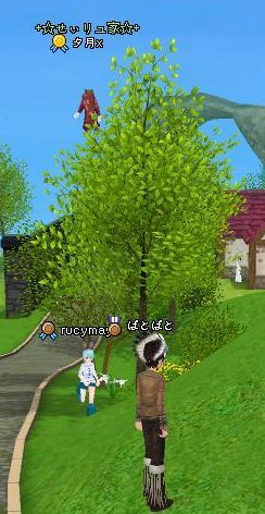 とこで、今回からまたホリホリのイベントが始まっているみたいで、試しに掘ってみたら、誰かが先に掘っていると表示が出ます。「あれ?見えない? バグか?」と思っていたのですが、惚れないので、しょうが無いので離れてみると、木の上で掘ってる!!
