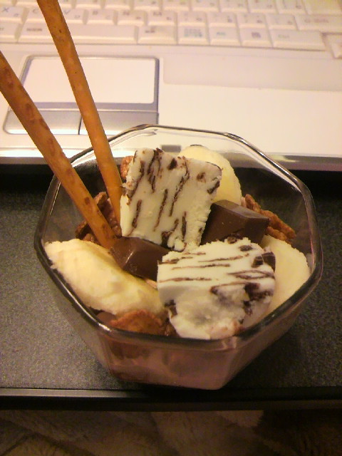 トッポ2本差して、パリパリチョコバニラのアイスをカットしてのせ・・