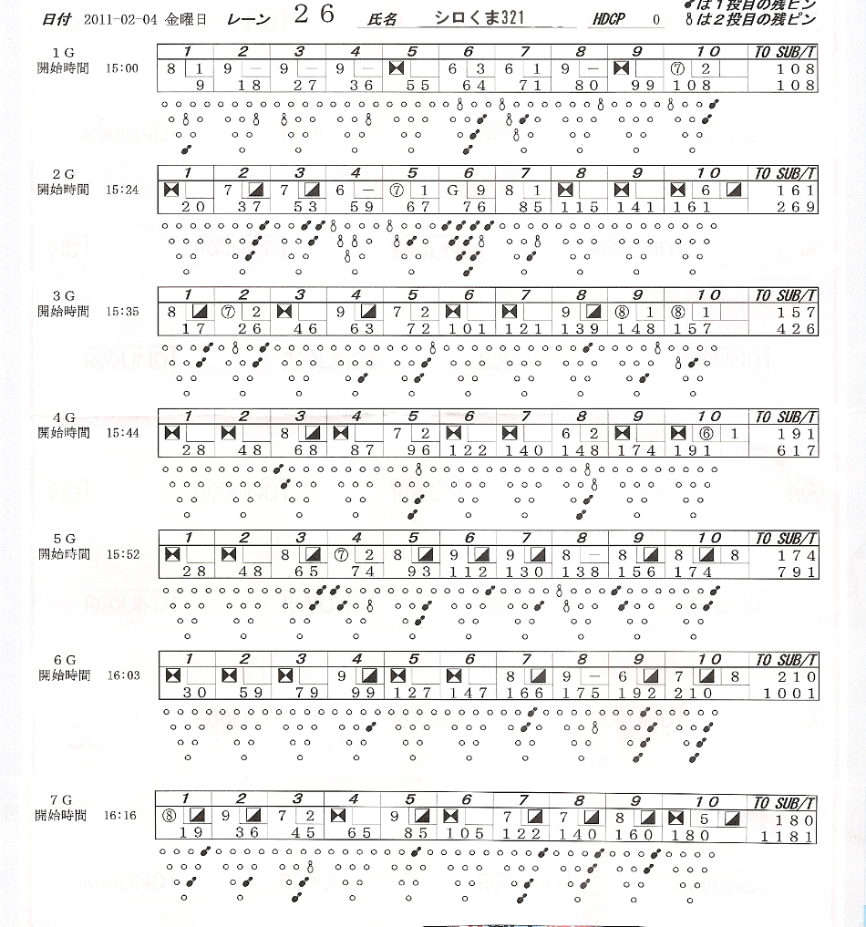 ハイスコアは1ピン差(クマ210vsマーク209)で勝ったのですが、1ゲーム目がひどすぎました・・・