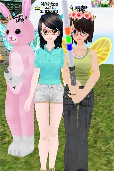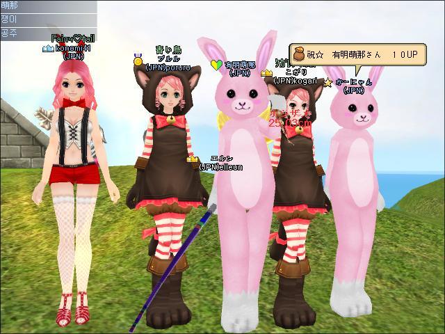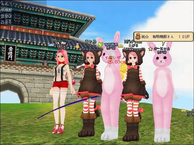 昨日のことです。 ぴこねさんが25UPをした後、そのまま南大門前でみんなでまったりと釣ってました。 そうしたら、二日前にミルトモになってUP式をした有明萌那がインしてきました。 聞くと、一人で釣ってる、とのことでしたので、KJに誘って一緒に釣りました。
