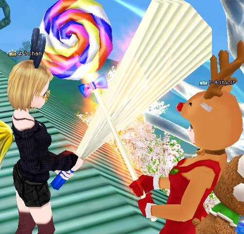 果敢にも、ハート竿でカタナに戦いを挑むぽめちゃ!