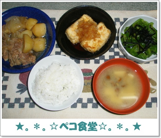 「肉じゃが・揚げだし豆腐・ピーマン昆布・白米・なめこのみそ汁」