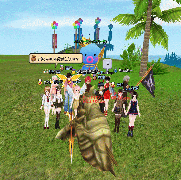 かわいいミニクラーケンの前で、ちょんじーさんが横向きで旗を出し
