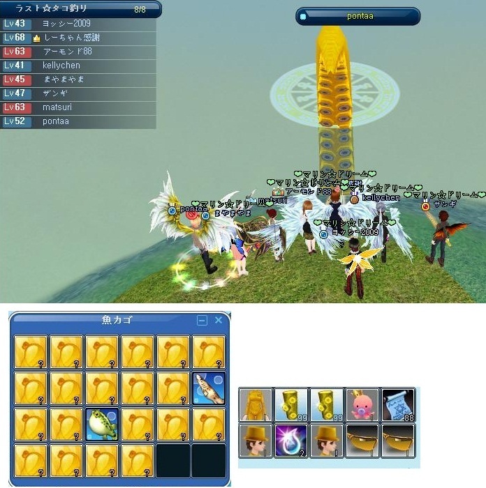 GWイベも最終日、マリンで最後の金タコ釣りしましたちょっとだけ自分もアメ投げさせてもらいました自分はF1キーににアメをセットしてやってたんだけど以前のような手間がいらなく便利だね^^胃袋もかなり出て精密するると材料が多く結晶も2個出たし、なにより女神が立て続けに2個出ました^^