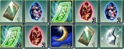 銀破片1、赤結晶5、青結晶3、カード2、10万券3、月2