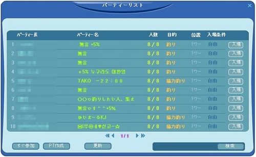 一応 KJに行ってPT探してみた。これは昨日の様子。全部のPTがキレイに8/8だったので記念に撮ってみたwこの後、募集が合ったので潜り込んでみたけど 赤・青共に出にくい><30分で1個しか出ず、1つも当たらなかった人も2名居ました。しぶいねー><