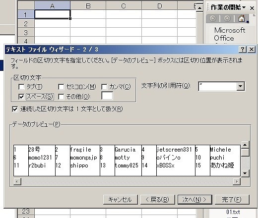 3、エクセルを立ち上げて保存したファイル名を読み込み、区切り指定のスペースにチェックをいれて完了する