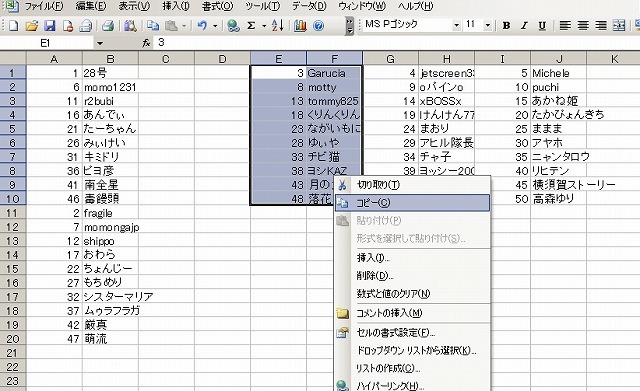 4、出席番号と名前で切り取って二列にまとめる