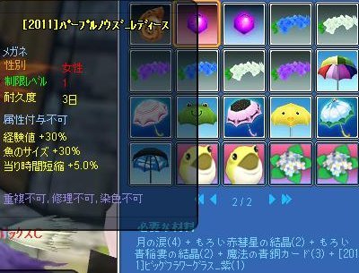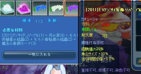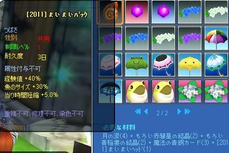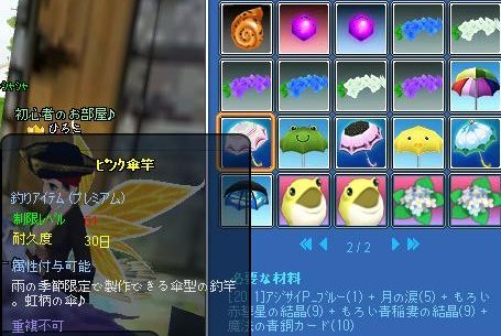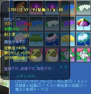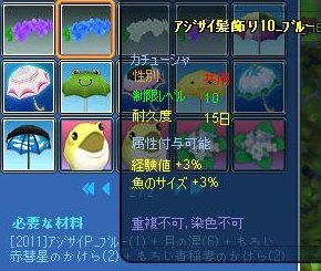 修繕不可もの(40%)なぜ今回から結晶2種とカードなのかしら?角が必要イベ花眼鏡が必要Lv40カチューシャは20%T^T青がサイズ、白が経験値、紫が時短に特化修繕可15%去年より確率下がってます( ̄▽ ̄;)竿は全部ブルーのパウダー使用竿10%・・・材料きつい><浮きは相変わらず4or5%、カエルが白パウダー・アジサイが紫パウダー使用です