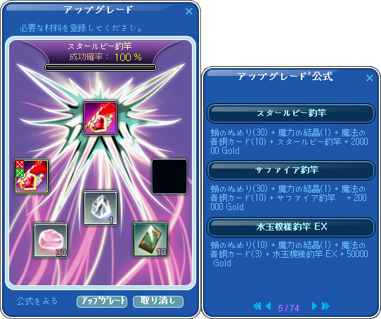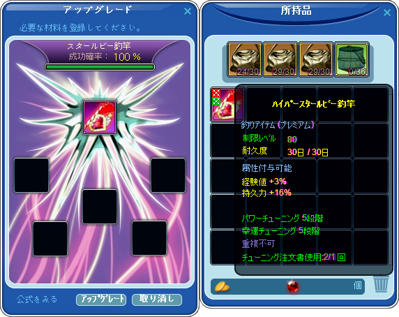 先週までの釣竿強化キャンペーン中にやっていればよかったのですが、先週は、結局75ガブリエルもやり直したため、75,82,85の都合3本もチューニング及びハイパー化を行ったため、80竿まで手が回らなかった、ということもありますが、本当に先週で運を使い果たしたように今週は全くだめです^^;