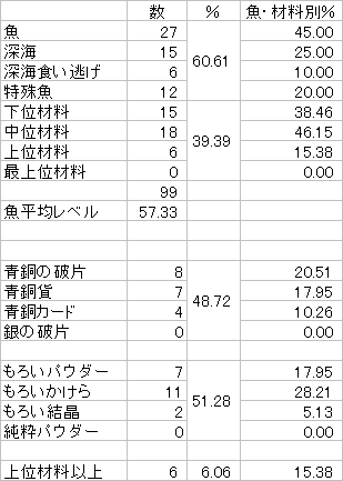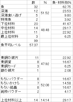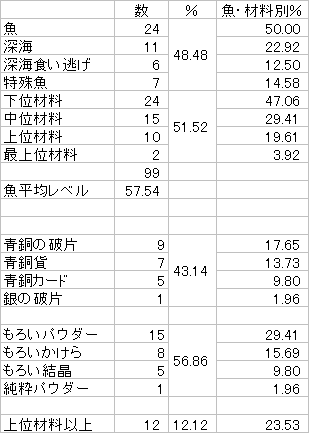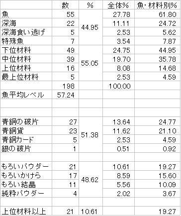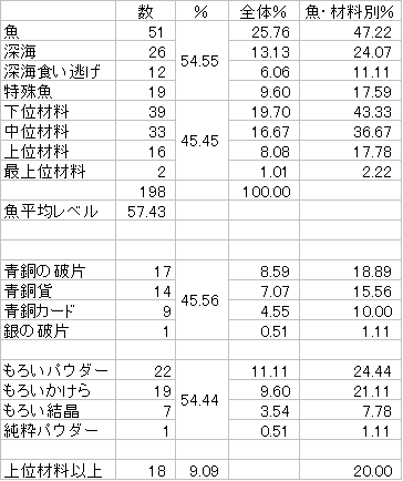 若干下位材料が多いものの、上位・最上位材料の釣れ具合は優秀です。